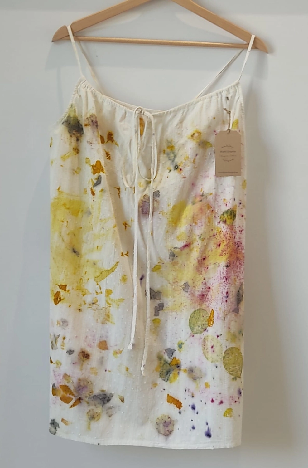 Kotoizko soinekoa, eskuz inprimatua eta landare inprimaketako ecoprint teknikarekin egina. Taila S, M, L eta XL.